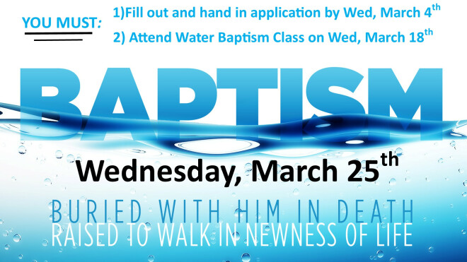 To be water baptized you must sign up, fill out an application (March 4th), and attend the class (March 18th)