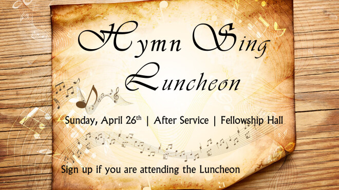 If you come to the Luncheon you must sign up for it Luncheon in the Fellowship Hall after service Hymn Sing starts at 2:30 pm