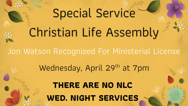Pastor Jon Watson is being recognized for obtaining his ministerial license through the Assemblies of God The service is Wed., April 29th at 7pm at Christian Life...